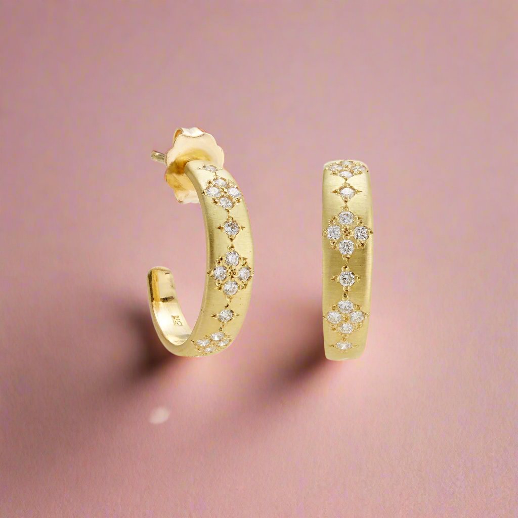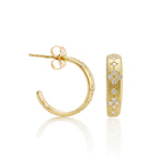 Made of 18-karat yellow gold, these elegant hoops sparkle with white diamonds arranged in Adel Chefridi's signature Memories pattern. Diamonds, 0.28ctw. Pierced only.