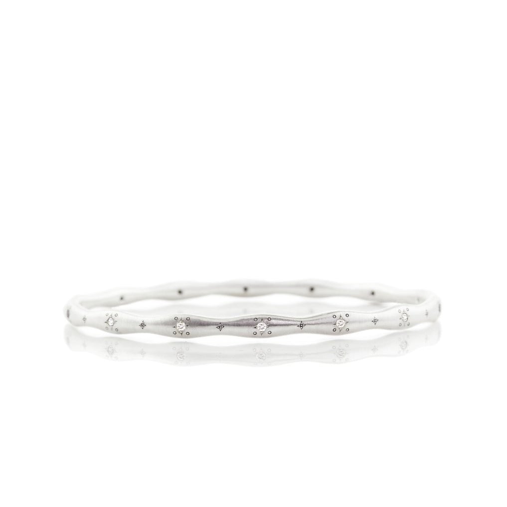 Featuring a wavy silhouette, this hand-etched sterling silver bangle shimmers with evenly spaced diamonds reminiscent of stepping stones.