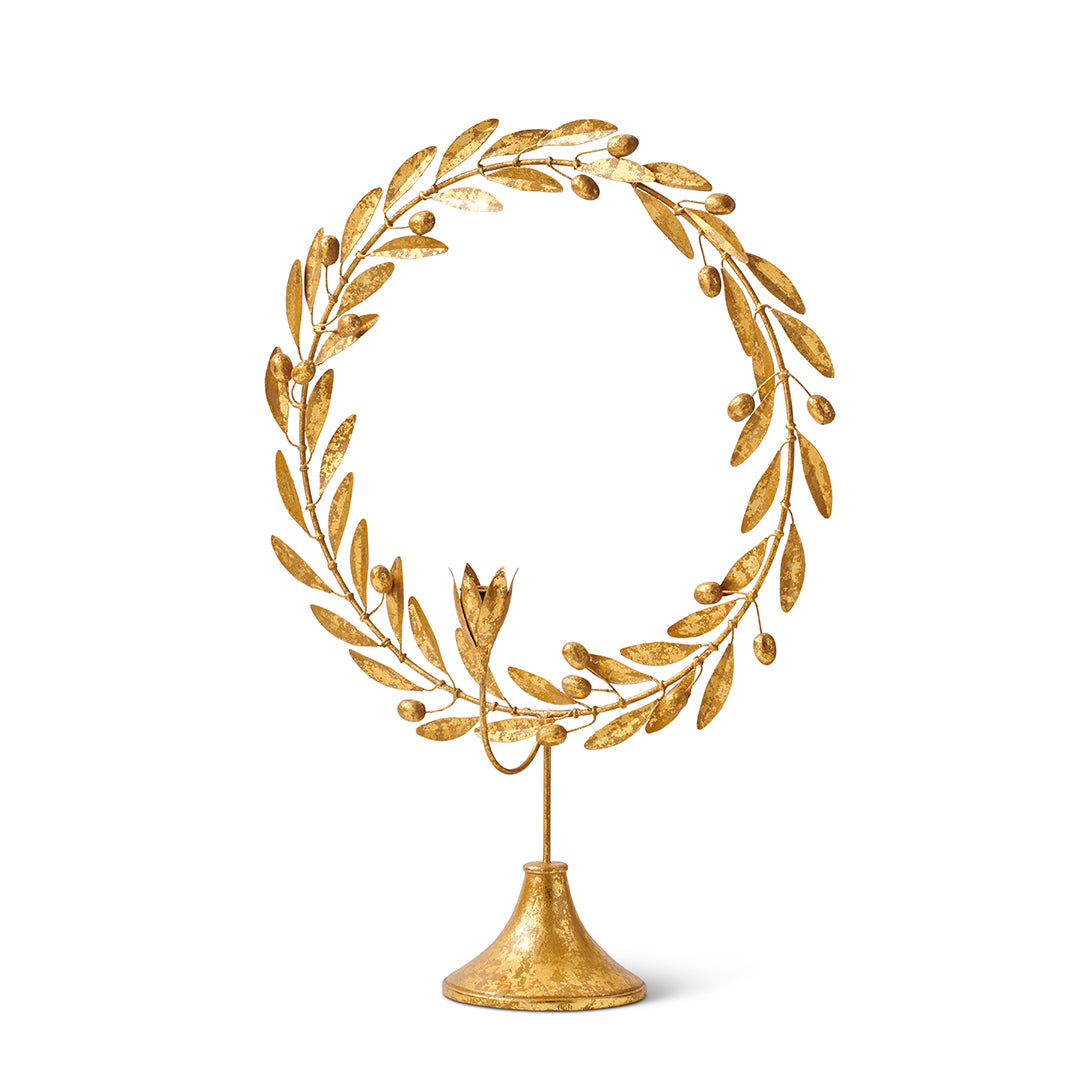 To create this elegant candleholder, a galvanized iron base and olives are hand-cast and the resin olive leaves are hand-embossed. Each piece is then assembled and painted by hand by skilled artisans with exacting detail. The result is a stunning sculpture that shimmers when it catches the light.