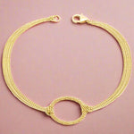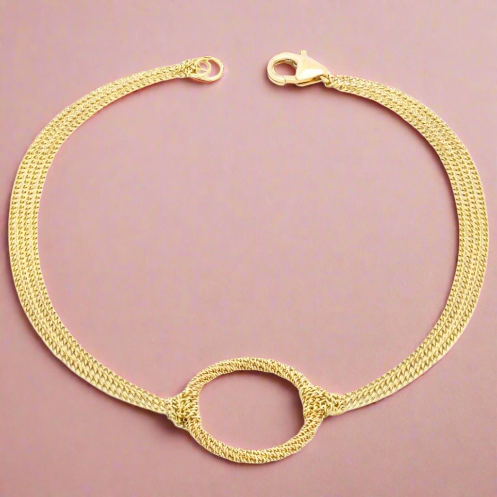 This deceptively simple bracelet has a secret: the handmade gold links reflect ambient light so brilliantly, you’ll think you’re wearing slender rivers of glimmering starlight. The two triple-strand side chains meet in the middle at a textured gold hoop that forms this design’s eye-catching central focal point.