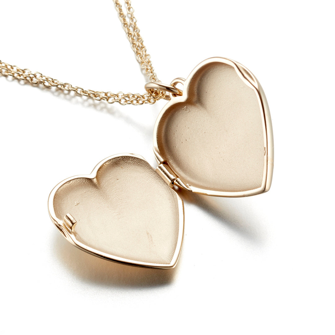 Our utterly timeless gold heart-shaped locket opens to hold two treasured keepsakes. Its clean, polished surface offers room for personal engraving — an heirloom in the making.