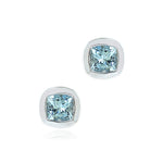 Square sterling silver earrings with rounded edges creates a modern frame for aquamarine gemstones.