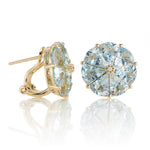 Crafted of yellow gold, these elegant earrings showcase radiant aquamarines. Celebrated for its exquisite pale blue color reminiscent of the sea, this popular gemstone is widely sought after for its captivating beauty and versatility. Aquamarine 7.50ctw. Diamond, .019ctw. 14-karat yellow gold. Pierced or clip. 5/8" diam.