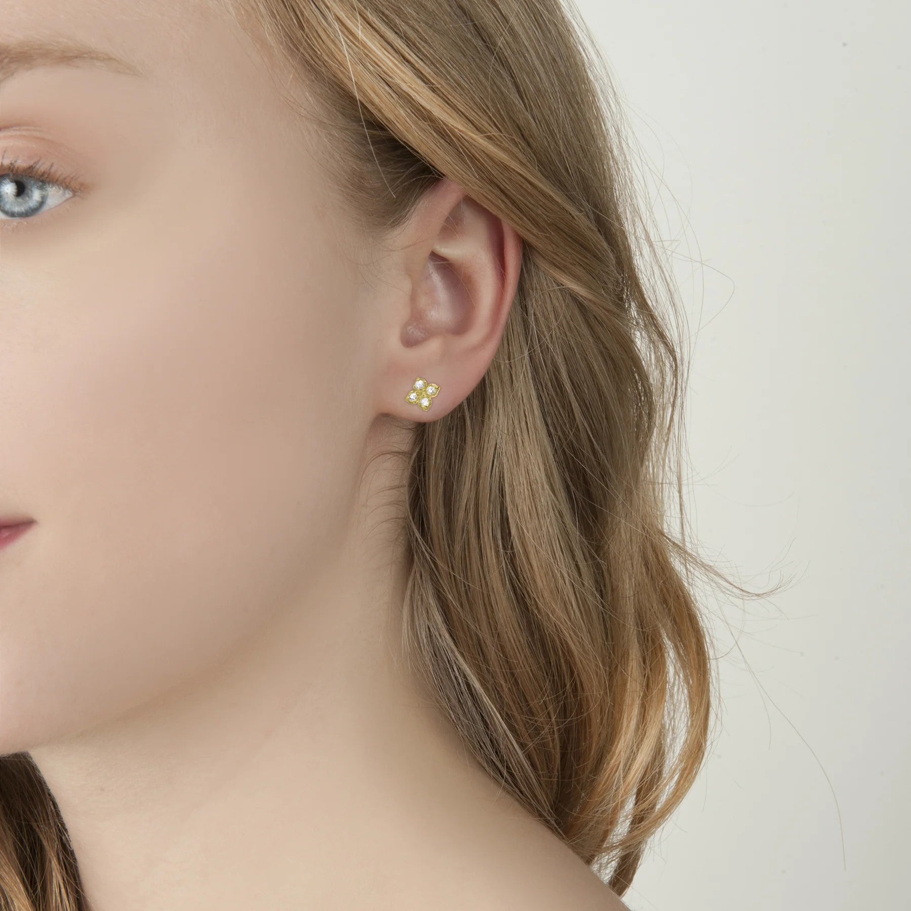 Shimmering rose-cut diamonds make the petals of these lovely gold earrings with a floral motif.
