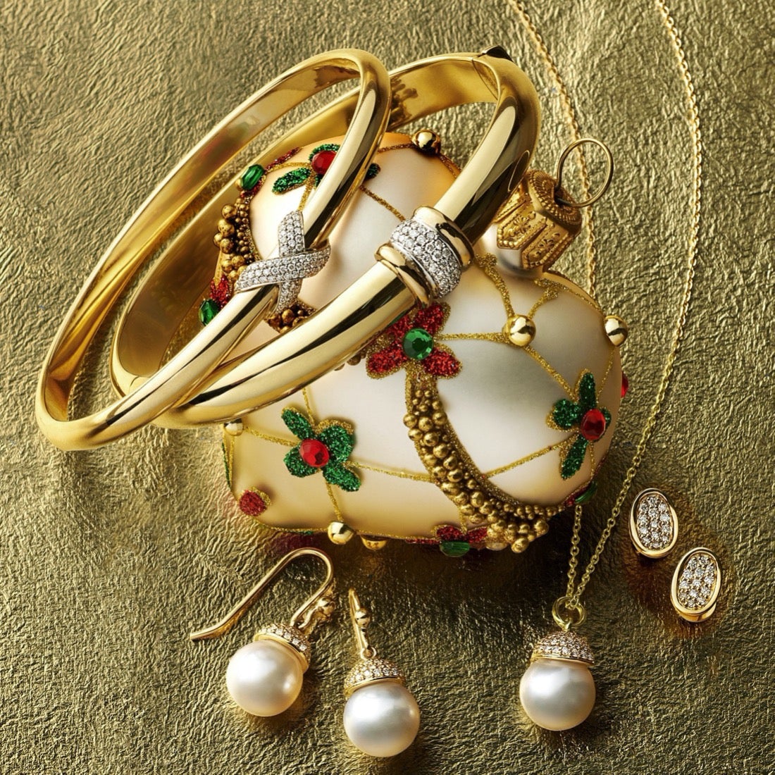 We offer complimentary gift packaging — a signature gold-lidded gift box with hand-tied satin ribbon — on all jewelry orders.