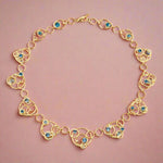 Delicately handcrafted in a lace-like design, this necklace features aquamarines and diamonds that add a touch of serene sparkle to its intricate golden filigree.
