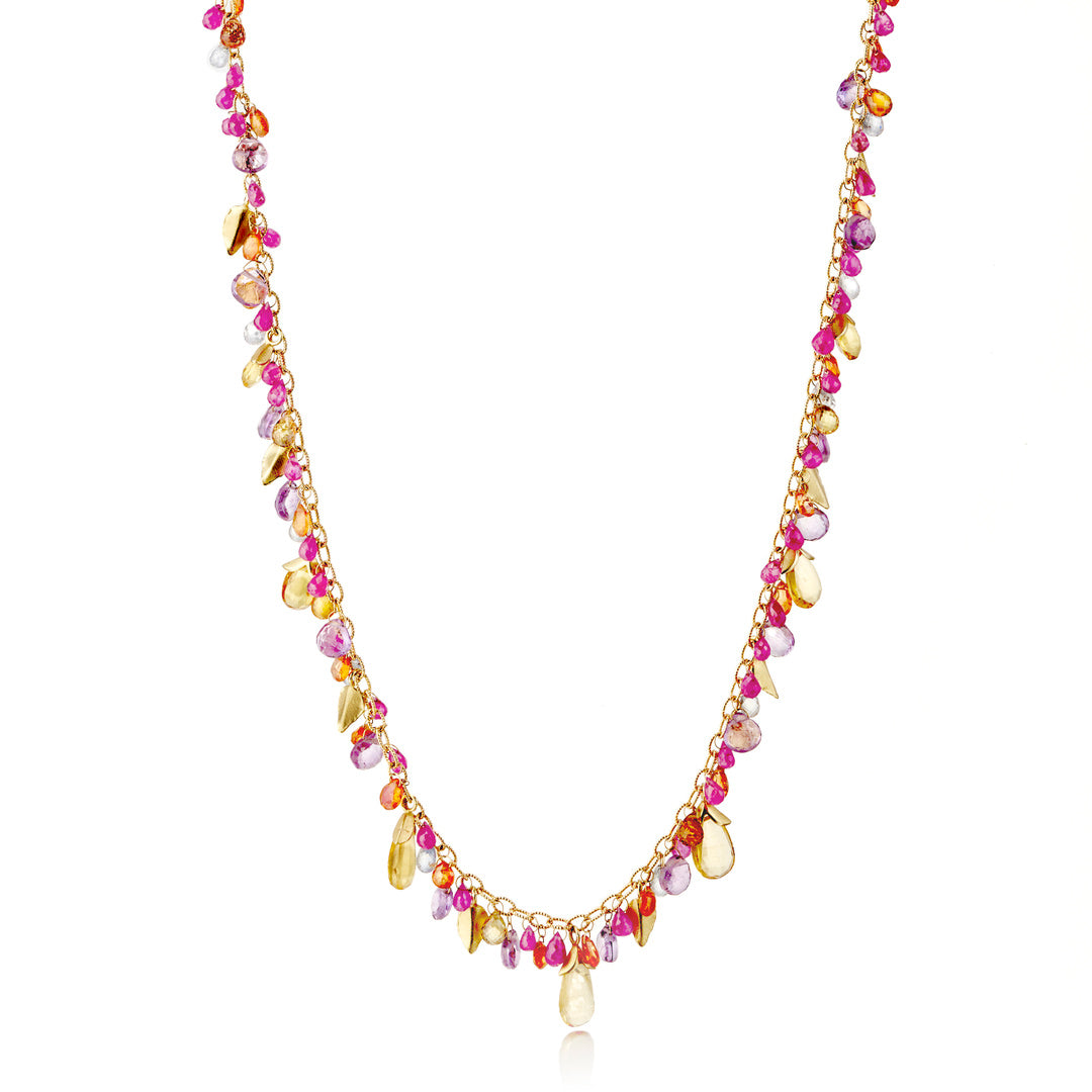 A lively mix of multi-color sapphires briolettes and drops of amethyst and yellow beryl drapes along a golden chain, interspersed with leaf-shaped charms. The necklace radiates movement, creating a joyful yet refined composition.