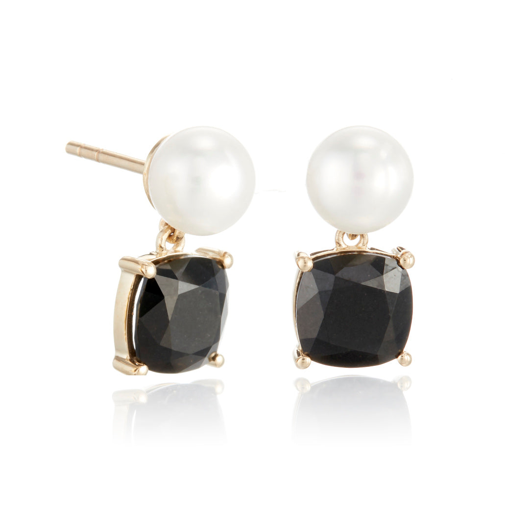 Offering a modern twist on classic materials, our earrings artfully pair the lustrous sheen of white round freshwater pearls with the deep allure of faceted black jade squares, framed in a minimalist setting that accentuates the contrasting beauty of each element.