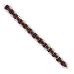 This bracelet unites emerald-cut rhodolite garnets and deep green tourmalines with accents of marquise and round diamonds. Crafted in gold and platinum, its bold palette and striking geometry give the piece a refined yet vibrant presence.
