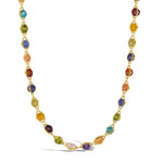 Handwoven with delicate strands of 18-karat gold chain, multi-color gemstones sparkle in symphony on this stunning necklace.