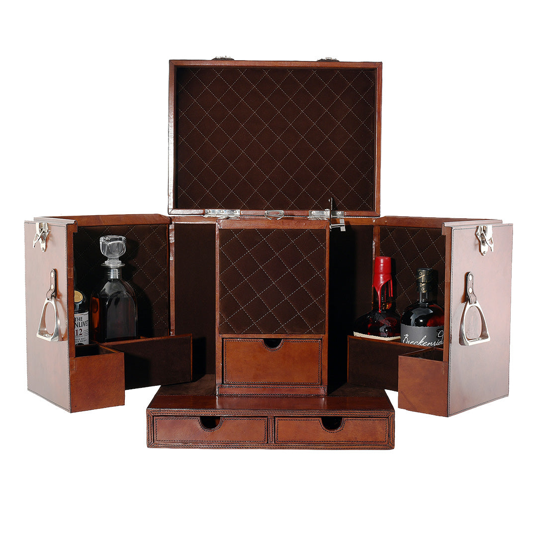 A true statement piece for the well-appointed home, this bar case brings equestrian elegance to the art of entertaining. Wrapped in rich, saddle-toned leather with quilted suede interior panels, it opens to reveal a world of thoughtful organization — complete with stainless steel bar tools, six gleaming shot glasses and a removable ice bucket nestled at the center. Pewter stirrup handles lend a refined equine nod, while deep drawers and side compartments keep every bottle and tool stylishly stowed. Whether closed as a handsome accent or opened for cocktails and conversation, the piece strikes a perfect balance of heritage craftsmanship and modern-day function.