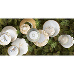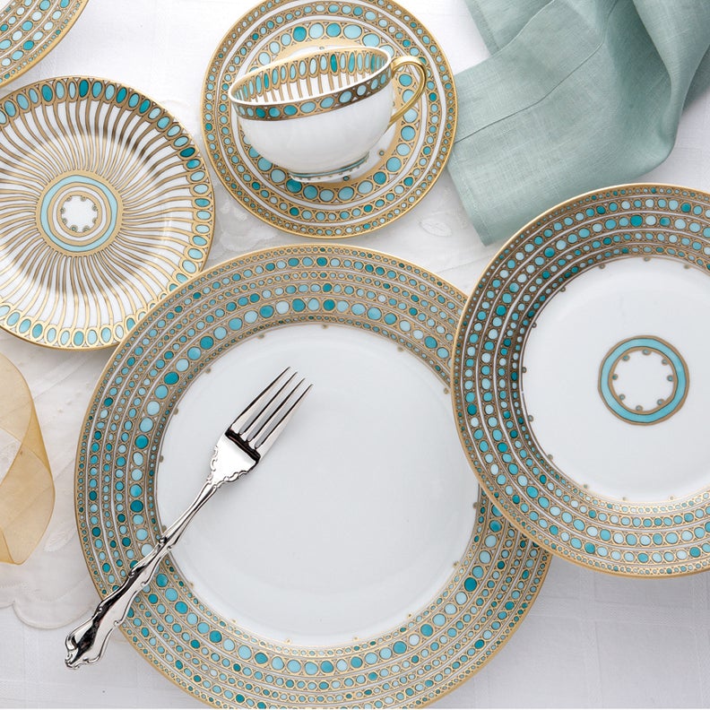 Made of Limoges porcelain, this striking five-piece place setting features an elaborate turquoise and gold motif inspired by the ancient Greek city of Syracuse and the remarkable landscape surrounding the Ionian Sea. Ideal for adding a refined touch to the table. Dinner plate: 11" diam.; dessert plate: 8 1/4" diam.; bread & butter plate: 6 1/4" diam.; teacup & saucer: 6 oz.
