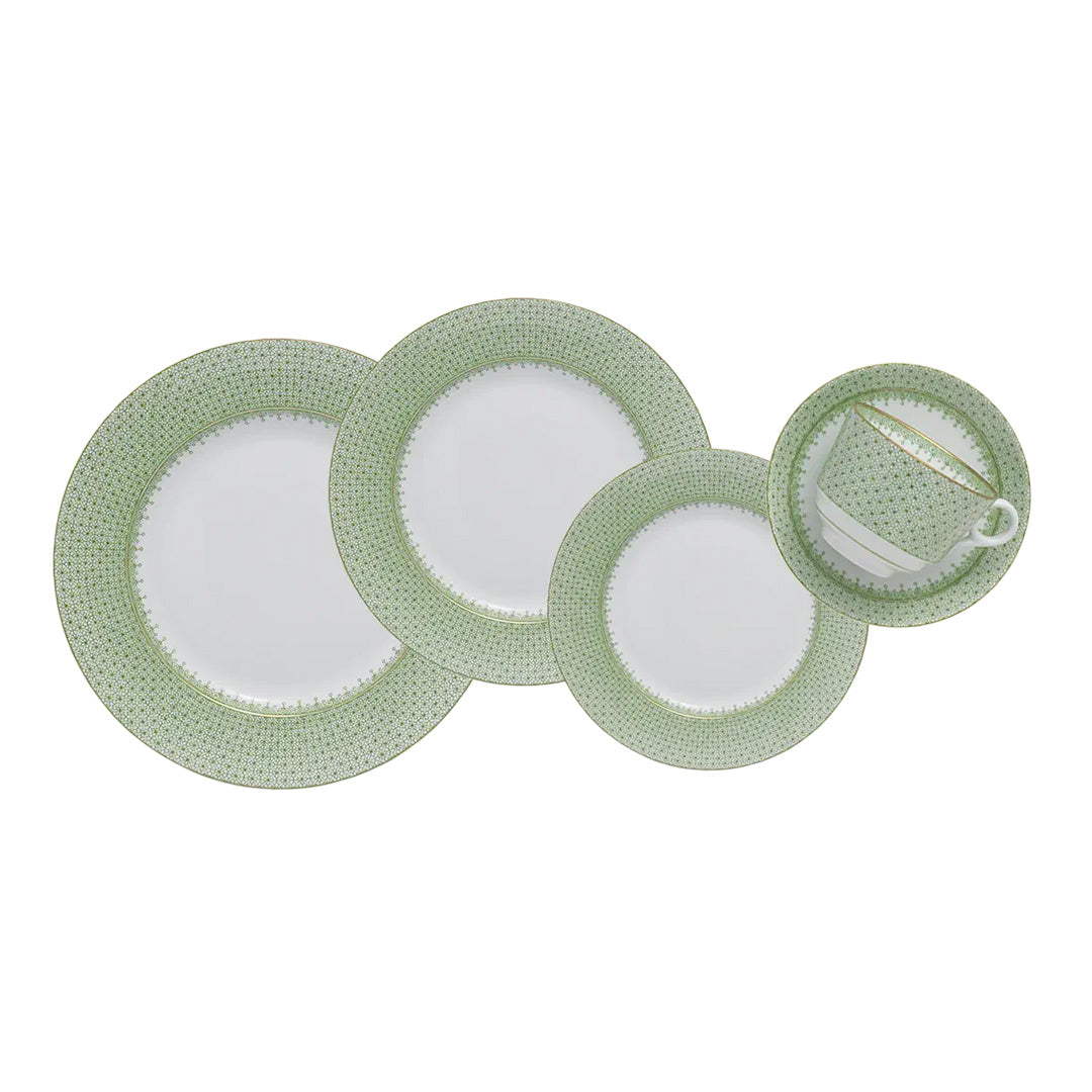 Made of porcelain, this five-piece place setting features a timeless lace-like border inspired by ceramics from China's Chi’ing Dynasty. Known for 85 years for its elegant Chinese and European-inspired porcelains, Mottahedeh still creates its wares through an age-old process and the very finest in materials. 22-karat yellow gold details. Dinner plate: 10 1/4" diam.; dessert plate: 8 1/2" diam.; bread & butter plate: 7" diam.; teacup & saucer: 3 1/2" diam., 2 3/4"H.