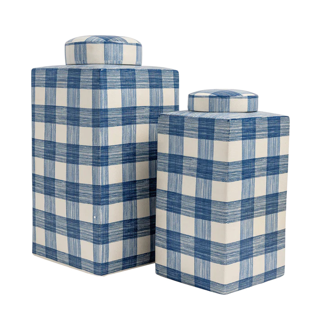 A fresh take on classic Americana, this square porcelain jar channels the spirit of Nantucket with its timeless blue gingham pattern. The hand-rendered lines add a casual charm, while the structured shape and lift-off lid keep the silhouette crisp and tailored. Whether styled on a bookshelf or set on a kitchen counter, it brings just the right balance of coastal ease and graphic polish.