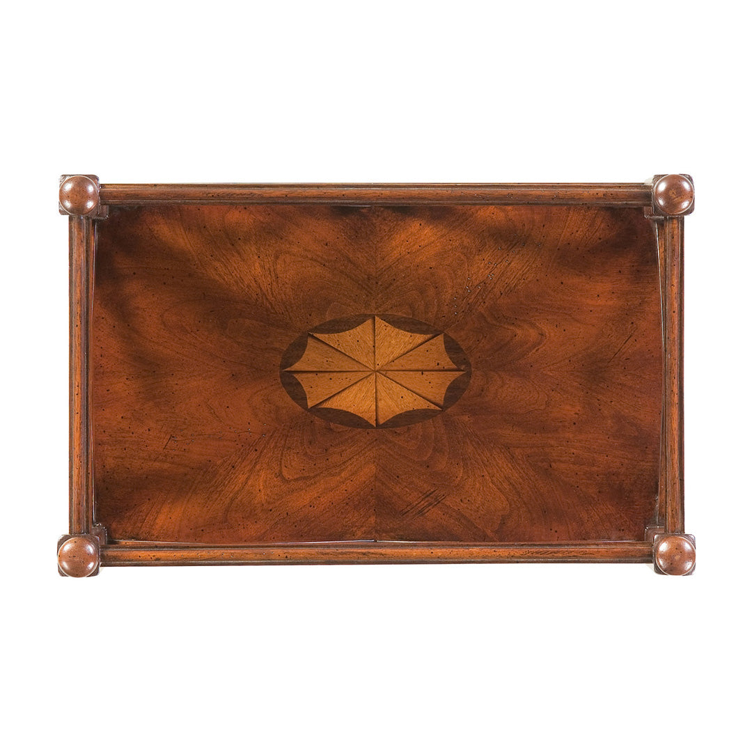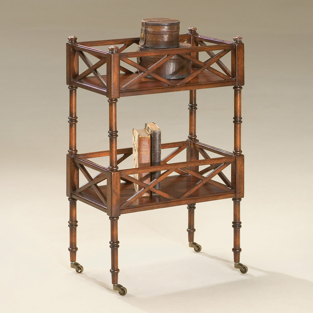 Defined by open fretwork sides and a warm cherry finish, this mobile server balances decorative detail with practical storage across two generously scaled shelves. Solid rubberwood legs and antique brass casters ground the design, allowing it to move easily while maintaining a composed presence.