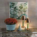 Dramatic and wonderfully rich in color with a natural green-colored stone, our accent lamp features a metal tapered shade finished all over in aged brass. Scaled so they can be displayed them as pairs on a mantle or bookcase, or under your kitchen cabinets.