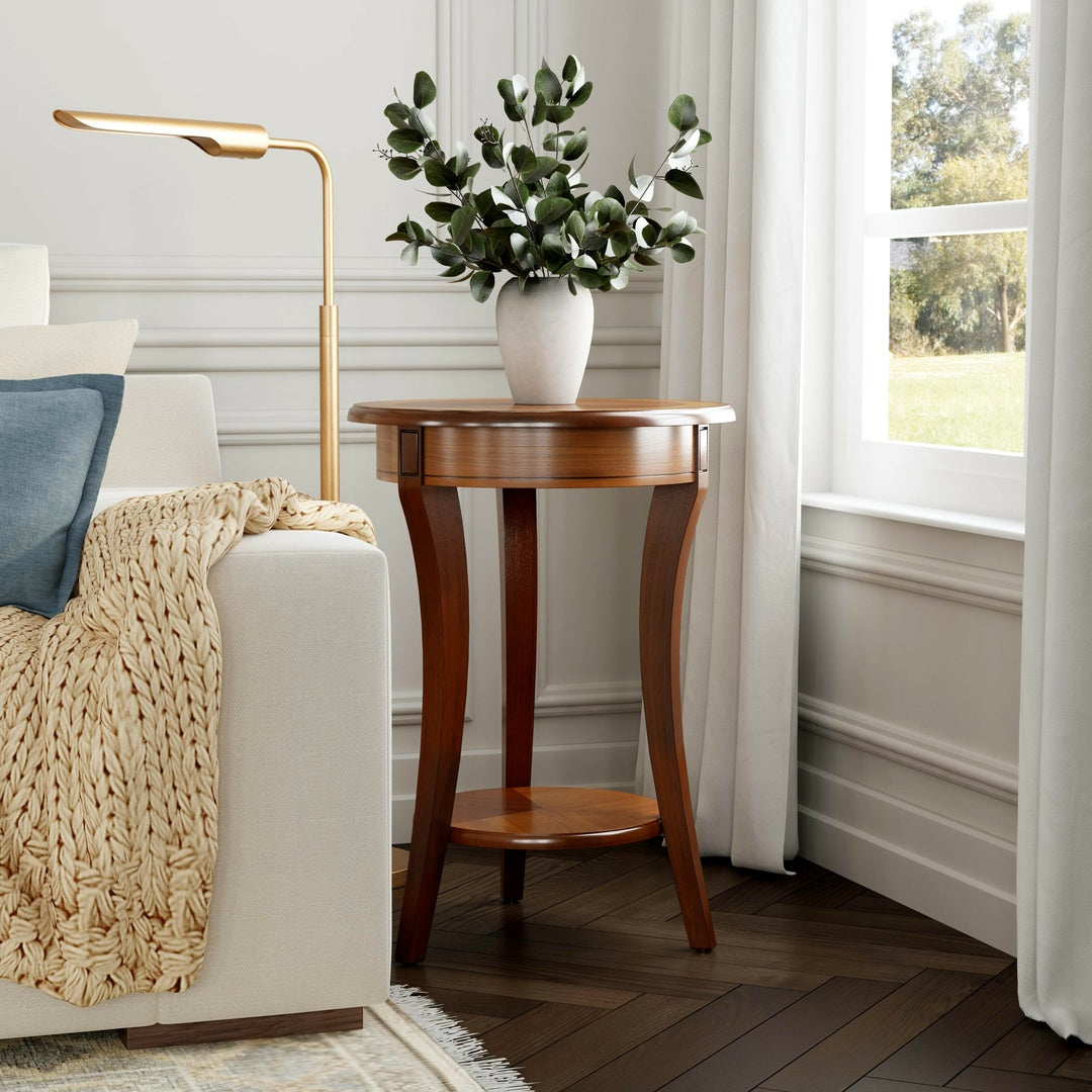 With its graceful curves and rich burl veneer, this side table blends vintage character with modern elegance. Crafted from poplar and hardwood using mortise and tenon joinery, it features a warm honey finish, splayed legs and a lower shelf for added functionality. A refined piece that adds depth and polish to any room.