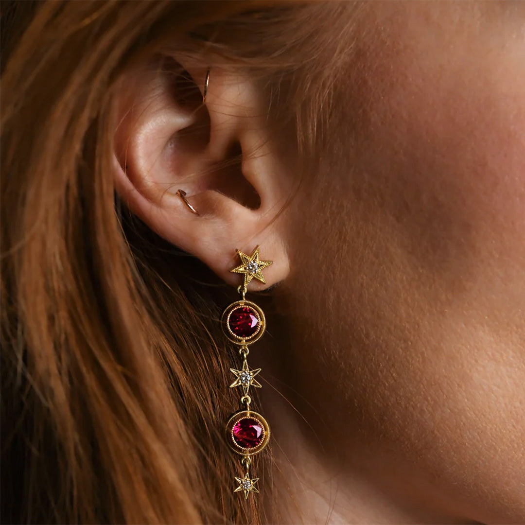 Radiant garnets in golden bezels alternate with diamond-set starbursts, creating a celestial cascade in 18-karat yellow gold. The earrings combine rich color and symbolic form, evoking a constellation brought to life in jewel form.
