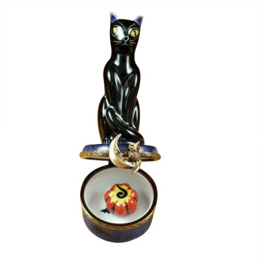 Limoges boxes come in an array of shapes and designs — from the witty and fanciful to the elegant and refined. This highly collectible miniature work of art is handcrafted and painted in the Limoges region in France, where the manufacturing of porcelain has changed very little in the last 300 years. Featuring a black cat against a night scene, our box opens to reveal a removable pumpkin hidden inside.