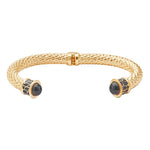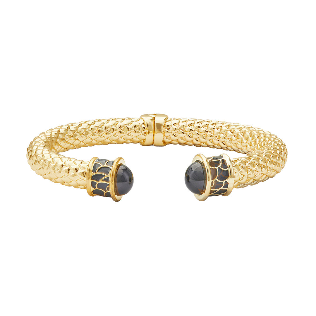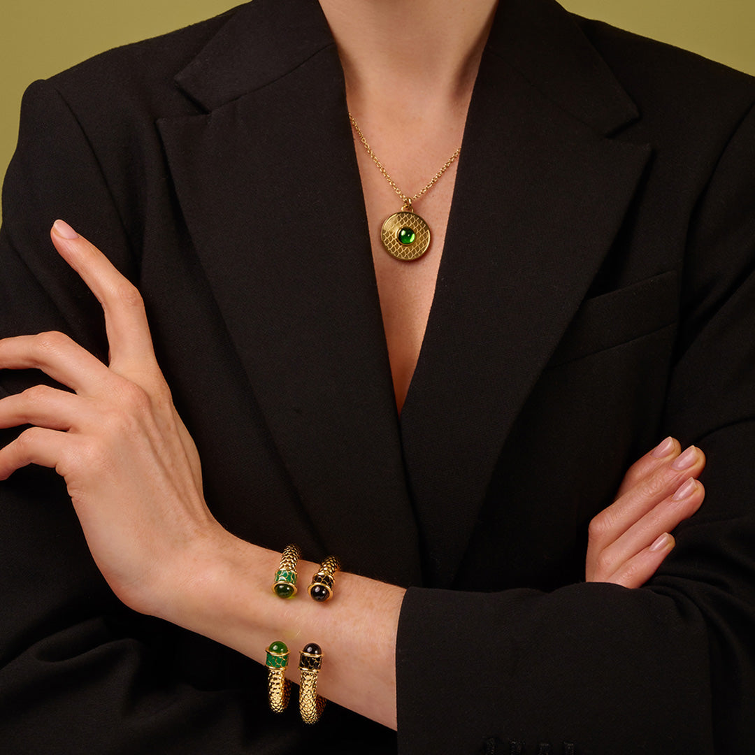 One of the oldest and most enduring styles of jewelry throughout history, torques have symbolized everything everything from wealth and nobility to bravery in a warrior. Halcyon Days has crafted theirs of 18-karat gold-plated brass with chic glass cabochons at each end, accented with a hand-applied timeless design — and a springed hinge to more easily accommodate most wrist sizes.