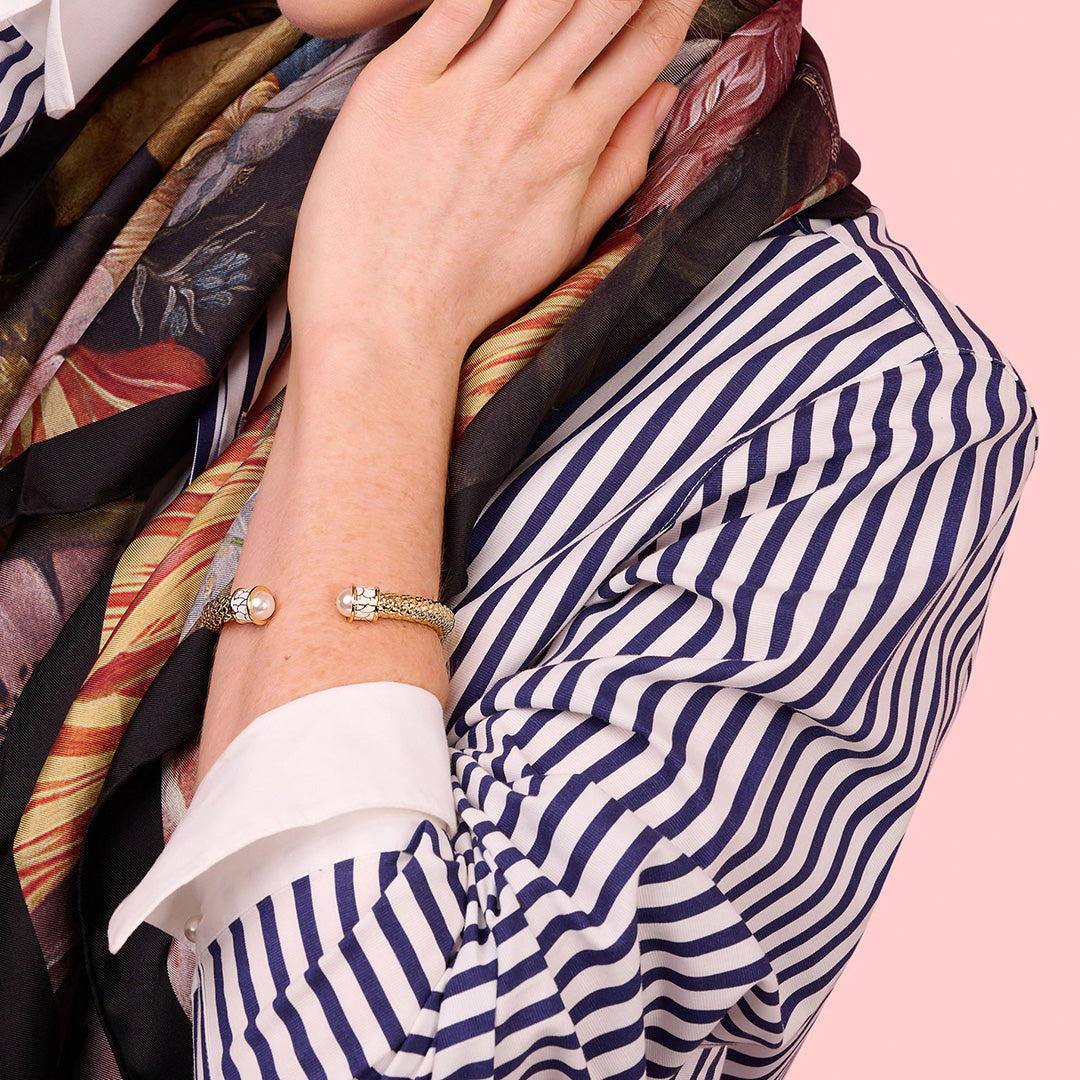 One of the oldest and most enduring styles of jewelry throughout history, torques have symbolized everything everything from wealth and nobility to bravery in a warrior. Halcyon Days has crafted theirs of 18-karat gold-plated brass with chic glass cabochons at each end, accented with a hand-applied timeless design — and a springed hinge to more easily accommodate most wrist sizes.