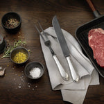 One of Robbe & Berking's best-loved collections, handcrafted Martelé (french for hand-hammered) features classic silhouettes in exquisite silver plate, and a modern mix of polished and textured finishes. The set of carving knife and fork features a diamond-like-carbon coating in anthracite-black (“Frozen Black”) — a combination of outstanding industrial properties with a refined technical look. Includes a gift-ready leather pouch. Since 1874, family-owned Robbe & Berking has refined and perfected the art of silver-making and metal-smithing. Handcrafted cutlery and tableware with the R&B hallmark are prized by experts and collectors around the world. Made in Germany.