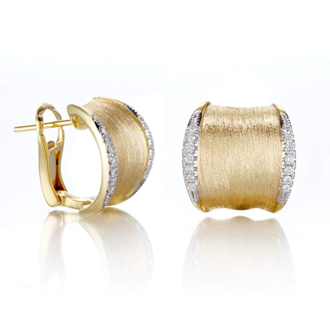 A study in contrast, these sculptural earrings pair a wide arc of brushed yellow gold with twin rows of round white diamonds. The softly textured surface brings warmth and dimension, while the precise diamond borders add structure and shine.