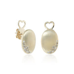 A refined mix of elegance and ease, our earrings feature brushed gold oval gently crowned by a scatter of champagne and white diamonds — an understated shimmer that subtly catches the light. The heart-shaped posts make an unexpected, yet charming finishing touch.