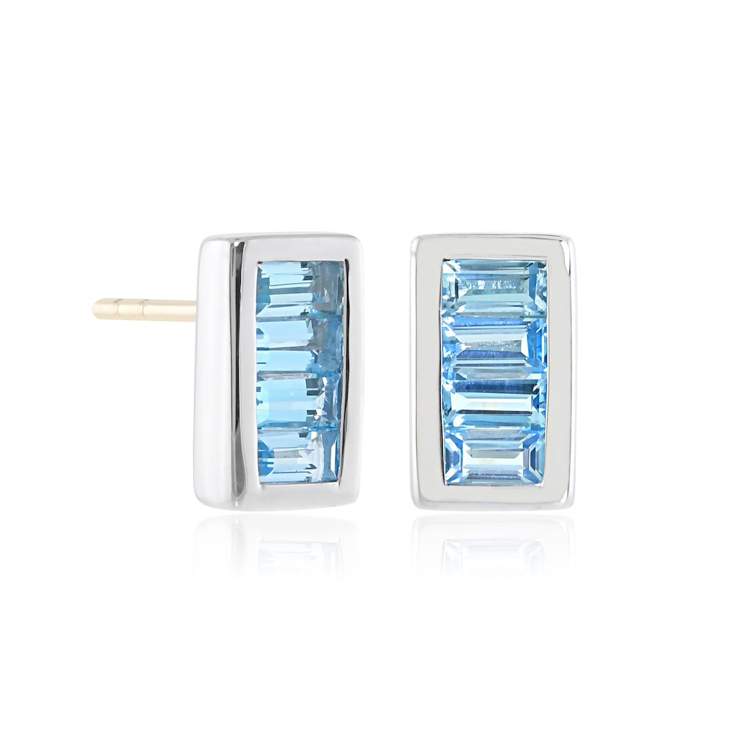 A reinterpretation of the classic channel-set gemstone ring, our earrings feature three Swiss Blue topaz stones set in sterling silver.