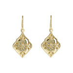 With their sculpted silhouette and patterned etchings, these drop earrings echo the quiet geometry of old-world talismans. A mix of sapphires and diamonds radiates from the center, giving the gold surface depth and tonal contrast.