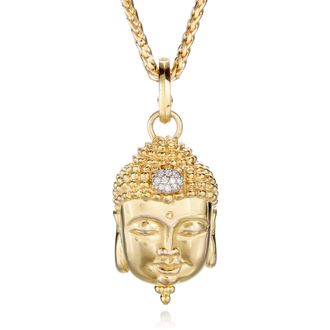 A quiet expression and gentle contours bring a sense of serenity to this sculptural gold pendant, inspired by traditional depictions of the Buddha. The finely textured crown is inset with a radiant diamond cluster, adding subtle brilliance to the symbolic form.