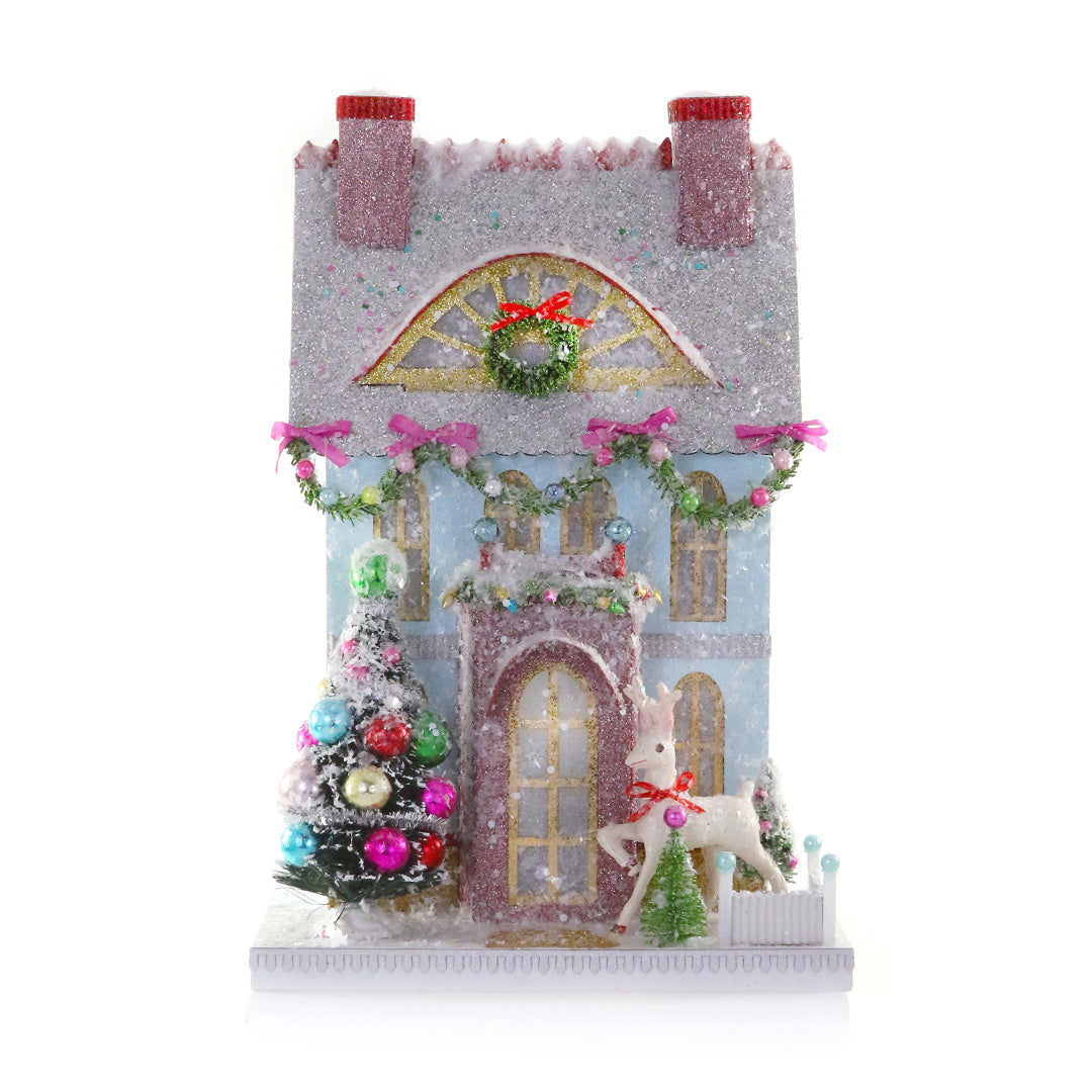A storybook handcrafted house dusted with snow sets the stage for a merry scene, complete with a proud reindeer at the gate and a tree glittering in its holiday best. Every detail, from frosted garlands to candy-colored ornaments, brings a touch of vintage cheer.