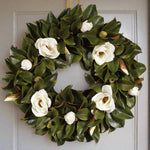 Handcrafted of faux magnolia leaves and flowers, this elegant wreath will add a cheerful touch to your home year after year. Highly skilled artisans paint and shape each petal and leaf by hand for astonishing realism. 30" diam.