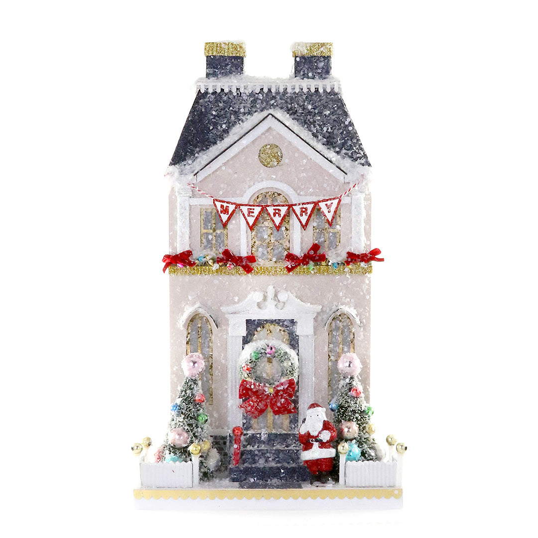 Festive from rooftop to doorstep, our stately handcrafted home beams with holiday joy. A banner of “Merry” waves across the front, while Santa himself waits to greet guests beside twinkling trees.