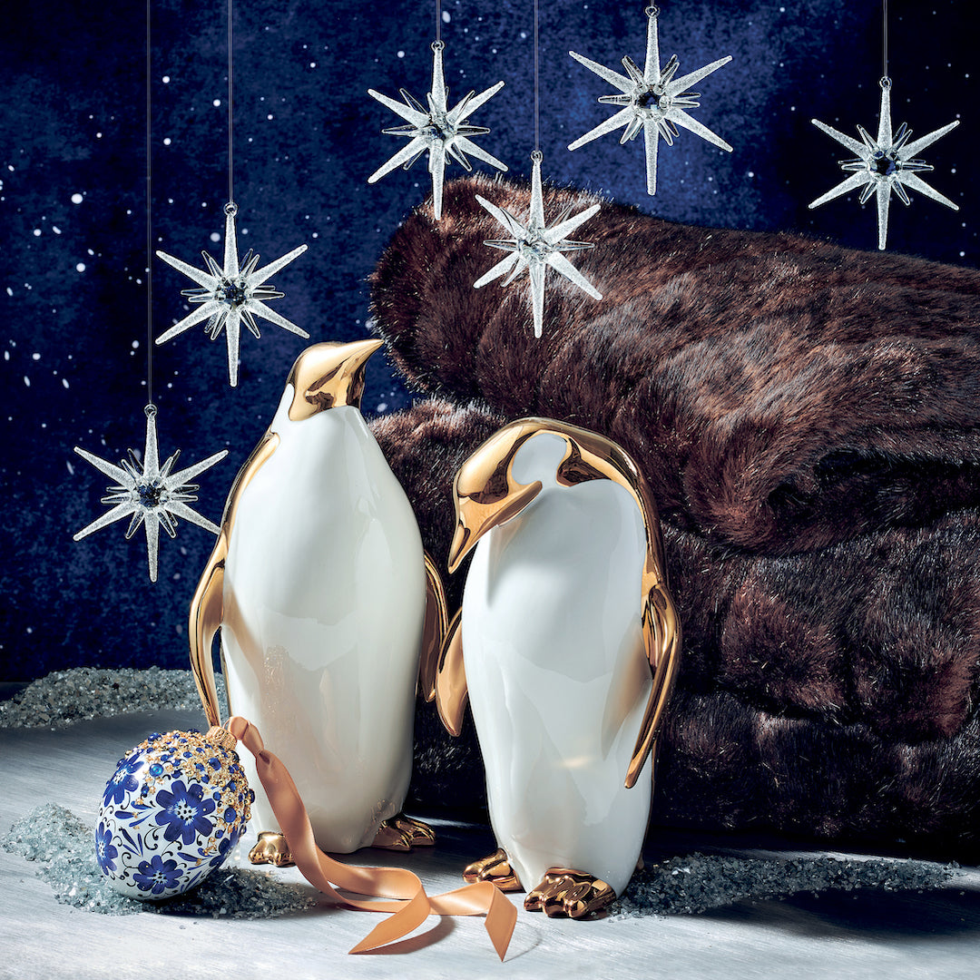 Charming and friendly, which makes them loved by all, penguins are the symbol of loyalty, unity and a dedication to family. With sleek bodies of white porcelain and handpainted accents of 24-karat gold glaze, they also bring home the holiday spirit of the North Pole.