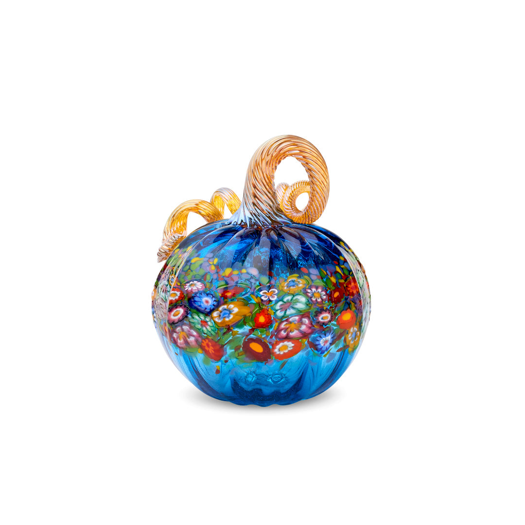 A swirl of millefiori blossoms wraps this mouthblown glass pumpkin, its floral band glowing against the richly colored body. Topped with a curling iridescent gold stem, it’s a jewel-like accent that celebrates harvest with artistry and charm.