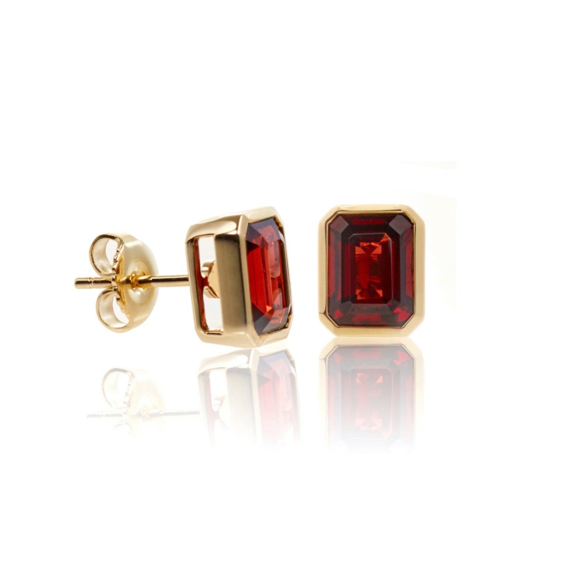 Understated, yet elegant earrings made of yellow gold and set with bold emerald-cut garnets. The birthstone for January, the gemstone gets its name from the pomegranate because of its similarity with the fruit's deep red color. Garnet, 3.80ctw. 14-karat yellow gold. Pierced only. 3/8"L x 1/4"W.