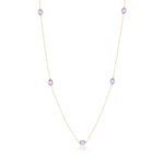 A delicate gold chain link necklace with alternating amethyst gemstones.
