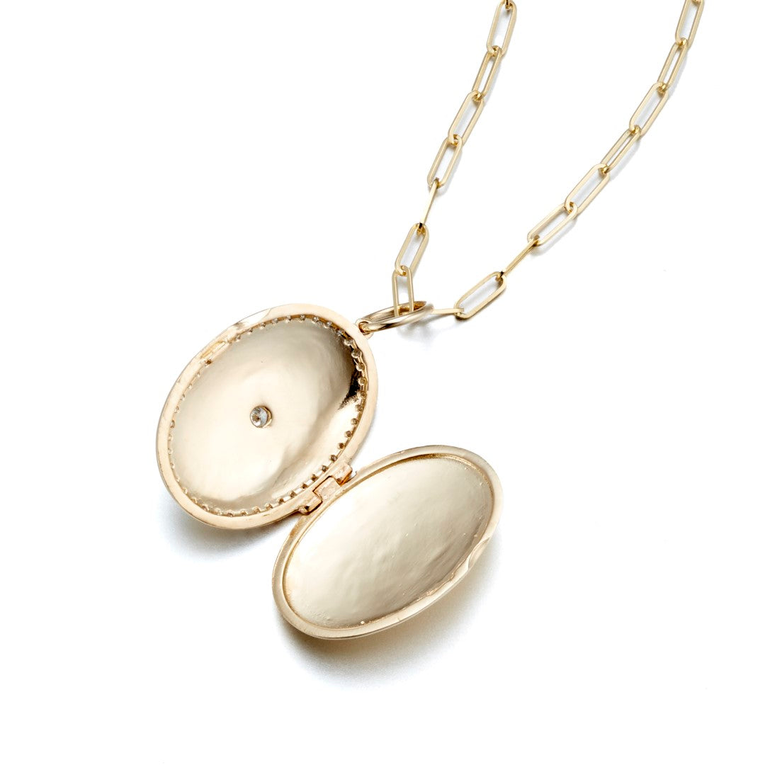 Encased in a brushed gold finish and surrounded by a halo of diamonds, this locket necklace is a modern take on a cherished classic. Since 1861, Gump's has been a destination for jewelry that is distinctive and timeless. Featuring only the finest materials, each piece offers a lifetime of enjoyment.