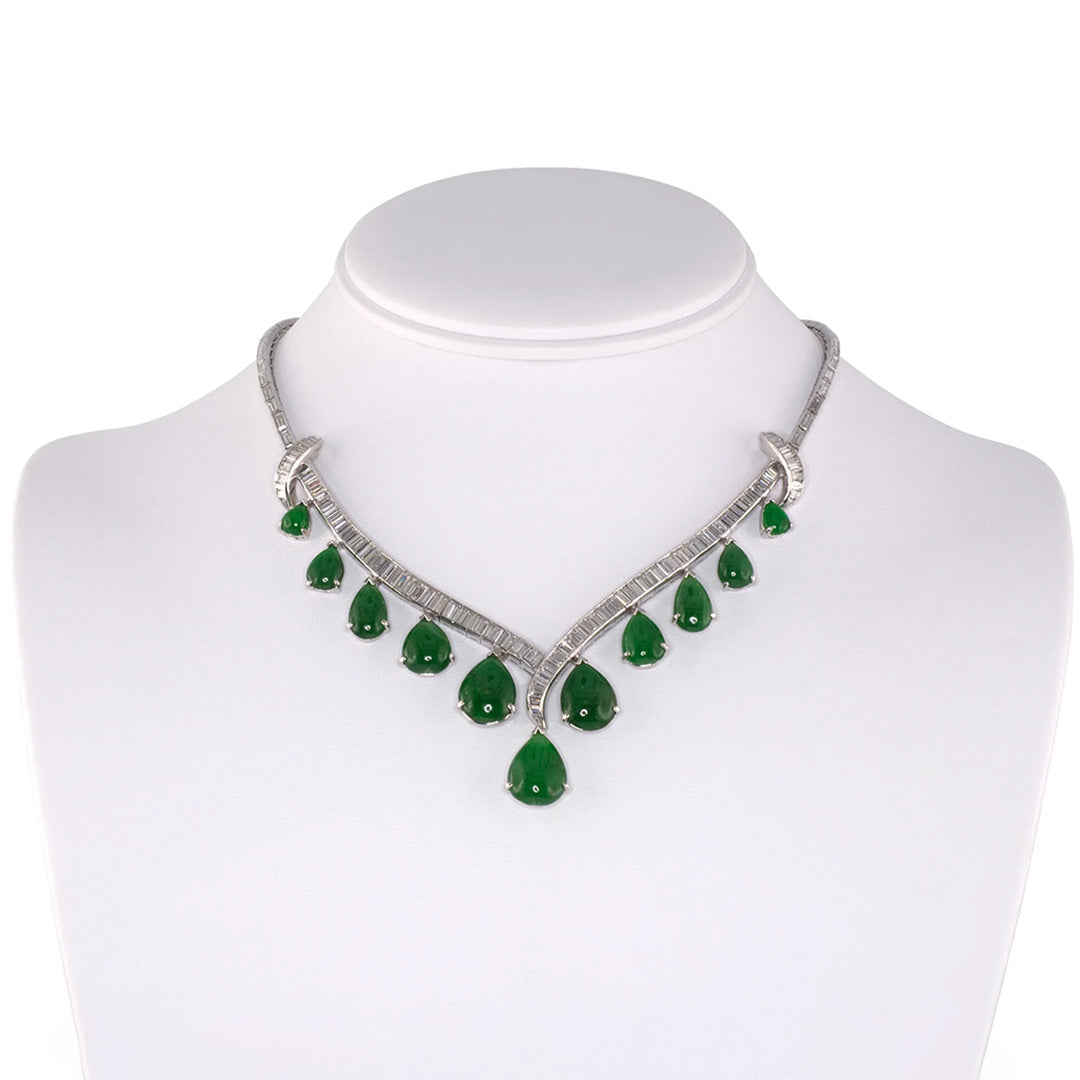 Forming a fluid 'V' silhouette, this platinum festoon necklace's sleek baguette-cut diamonds lend a refined architectural structure, while the verdant jadeite pear-shaped cabochons introduce a striking contrast—an embodiment of timeless sophistication and impeccable craftsmanship. Gump’s is forever treasure hunting for the best of everything and our collection of estate jewelry — featuring rare antique pieces — is no exception. Distinguished in provenance, each item is one of a kind, reflecting its distinctive gemstones, materials and craftsmanship.