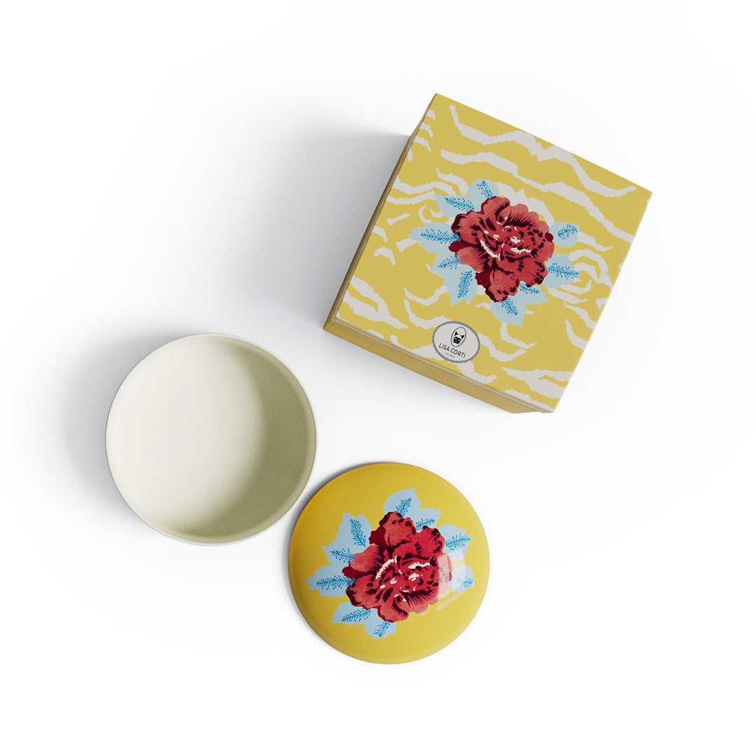A vibrant tiger motif and bold floral bursts unfold across this porcelain trinket box, capturing Lisa Corti's signature spirit of maximalist elegance.