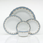 Made of white porcelain and handpainted by master artisans in Hungary, this elegant saucer is bordered in light blue and 24-karat yellow gold. Herend’s porcelain creations feature a signature pattern that dates back to 1874, when a fish-scale decoration inspired a craftsman to create a similar design. 5 1/2" diam.