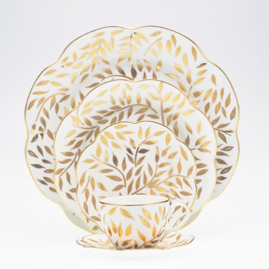 Made of white porcelain, this distinctive scalloped tea saucer features a 24-karat yellow gold foliage motif inspired by the beauty of olive groves across the Mediterranean. Founded in 1797 and one of the oldest existing porcelain manufacturers in Limoges, France, Royal Limoges uses centuries-old techniques paired with advanced technology to produce exceptional tableware.