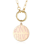 A message of optimism rendered in soft pink enamel, this charm reads bonne chance — French for “good luck.” Its round gold surface and whimsical typography lend a vintage air to the sentiment.