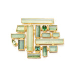 An architectural composition of baguette and round green tourmalines forms the striking centerpiece, set in radiant yellow gold. Designed to be worn as either a pendant or a brooch, the piece showcases versatility while maintaining a bold, modernist presence.