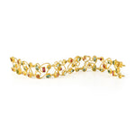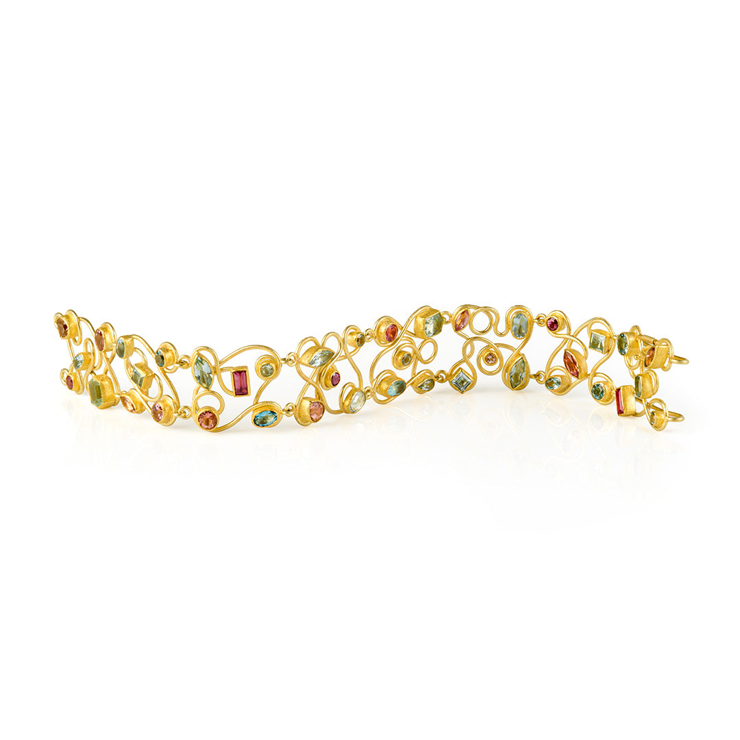 A freeform composition of rich 22- and 18-karat yellow gold winds around an array of faceted aquamarines and pink tourmalines. Each stone is cut in a different shape—oval, square, marquise—adding rhythm to the bracelet’s lyrical, openwork design.