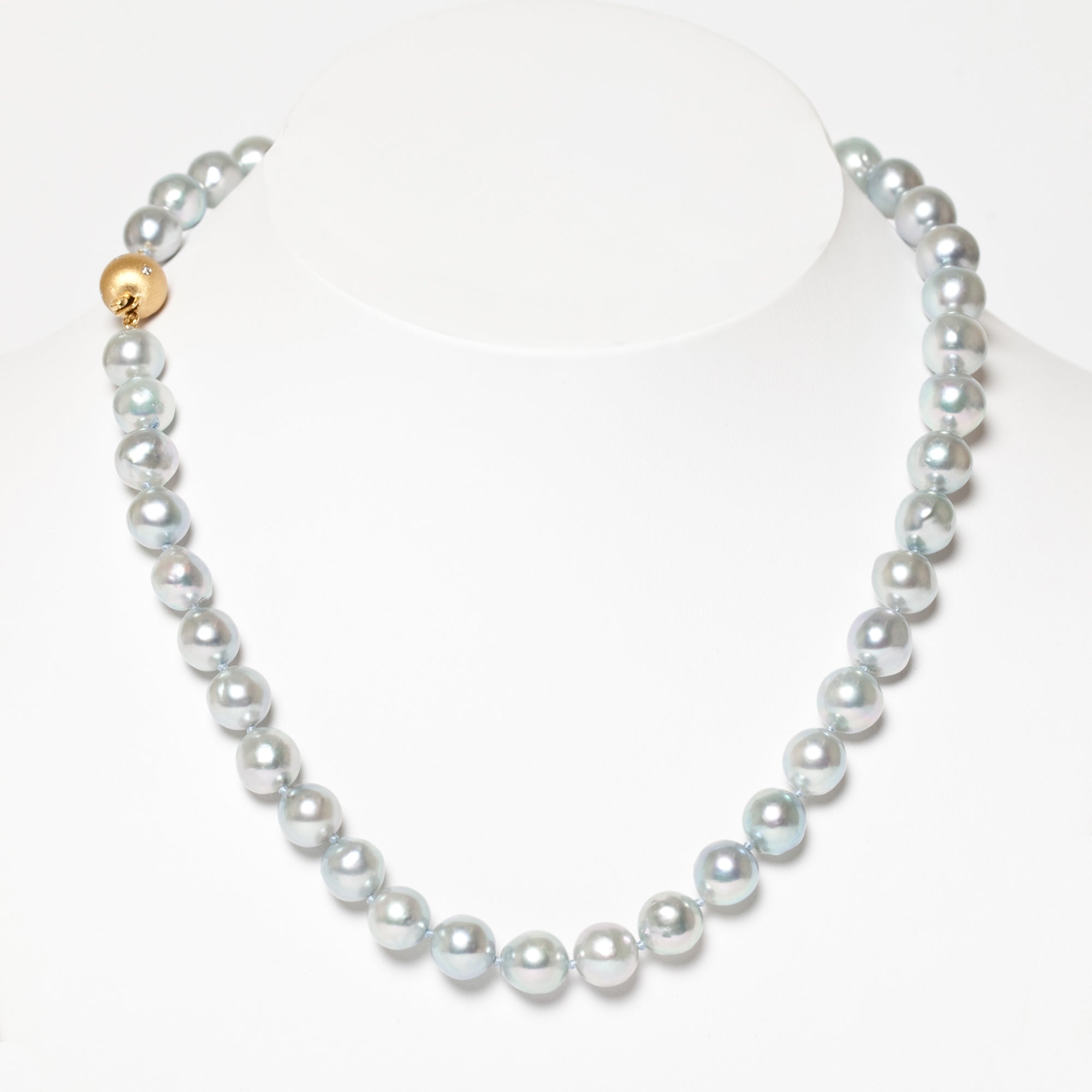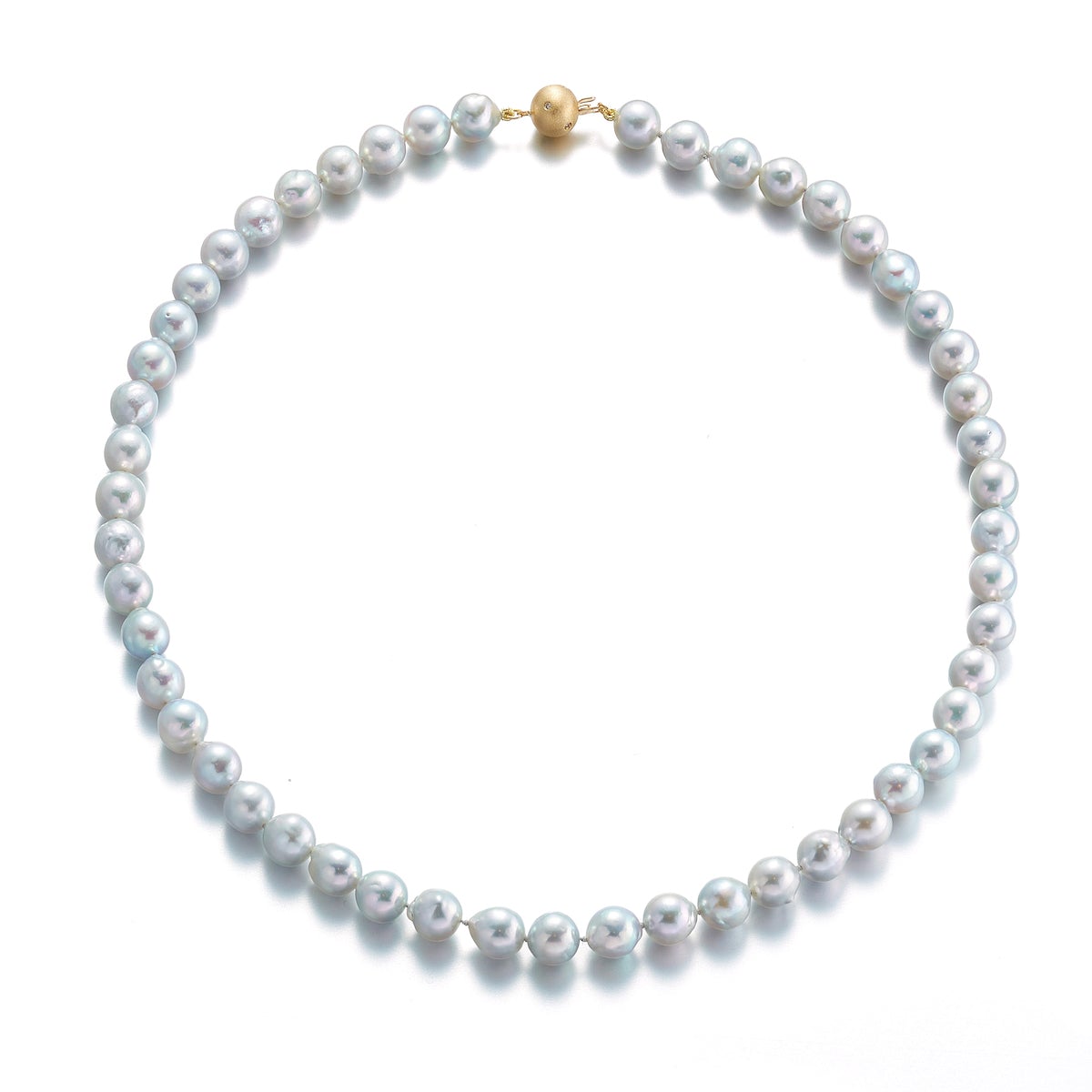 Simple statements of elegance, pearls have been a mainstay in Gump's fine jewelry assortment for decades. Revered for their alluring luster and classic beauty, they are widely recognized as symbols of purity, integrity and wisdom gained through experience. To create this necklace, each pearl is carefully selected for quality, color and shape. Blue Akoya cultured pearls, 7.5mm. Diamonds, 0.04ctw. Brushed 18-karat yellow gold. Hand-knotted on fine silk thread. 17"L.