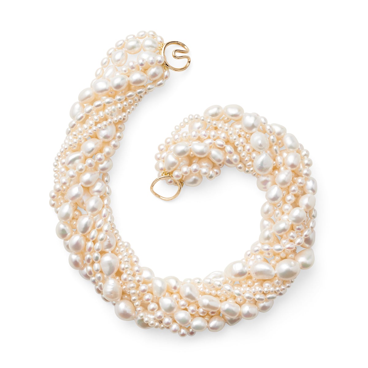 Timeless and classic, pearl necklaces have been a mainstay in Gump's fine jewelry assortment for decades. Comprised of eight strands of baroque pearls of all different shapes and sizes. White freshwater cultured pearls. 14-karat yellow gold. 18"L.