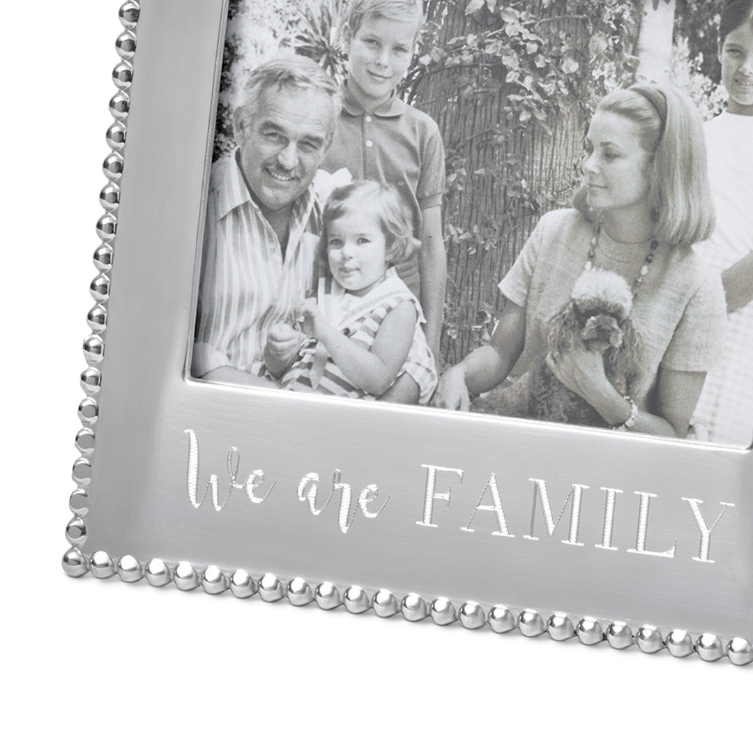 A heartfelt way to showcase the people who matter most. Crafted of sand-cast recycled aluminum with a gleaming silver finish, this frame is etched with “We are Family” beneath the photo opening and bordered with a beaded trim. A thoughtful gift or keepsake, it holds a 5" x 7" photo behind glass.