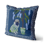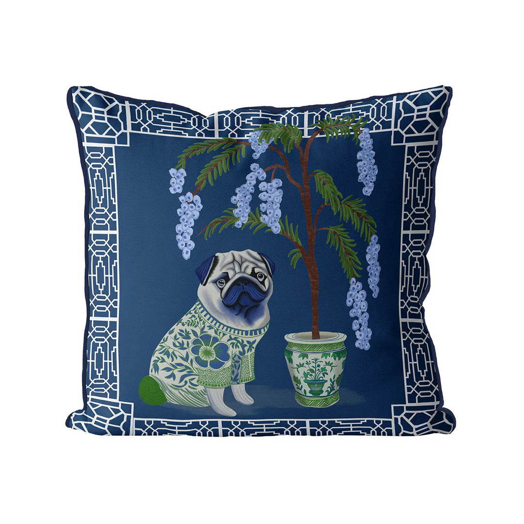 In a tailored chinoiserie jacket and surrounded by garden motifs, this dapper pug makes a delightfully unexpected statement. Printed on a handcrafted cotton-linen cover in deep navy, it lends an enchanting touch to the spring home.